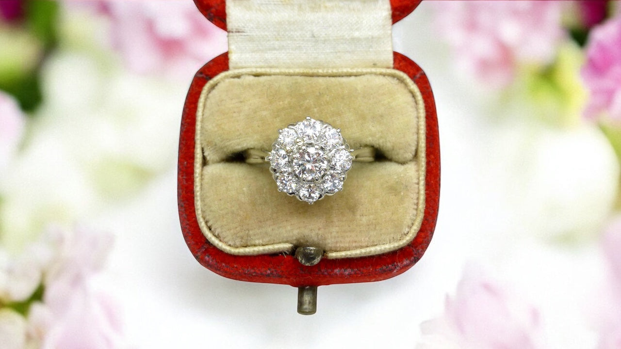 Vintage 18ct Natural Diamond halo cluster ring 0.88ct