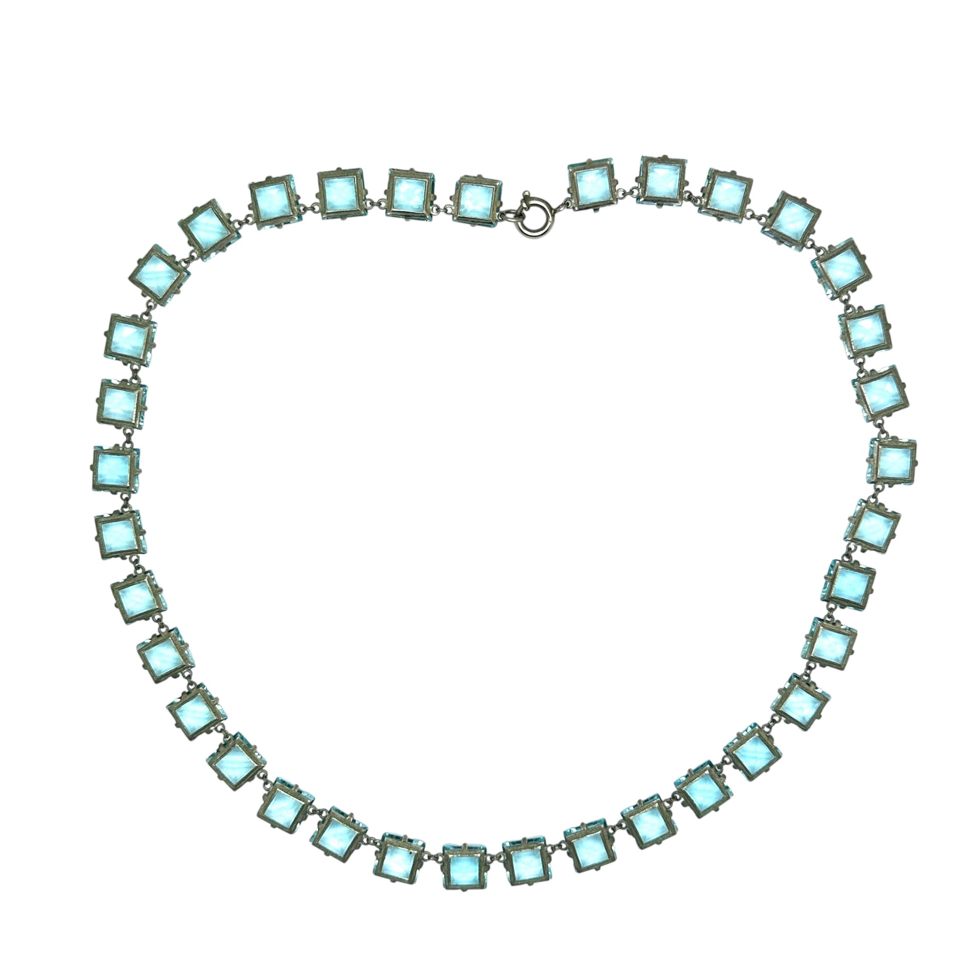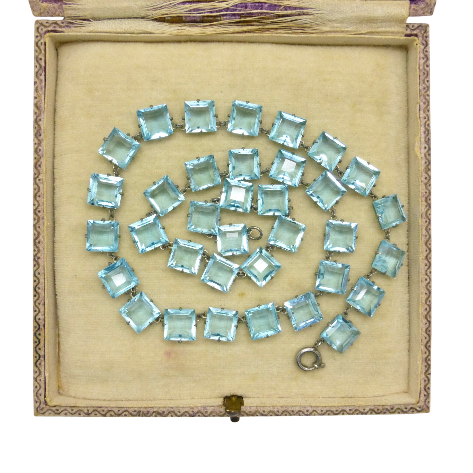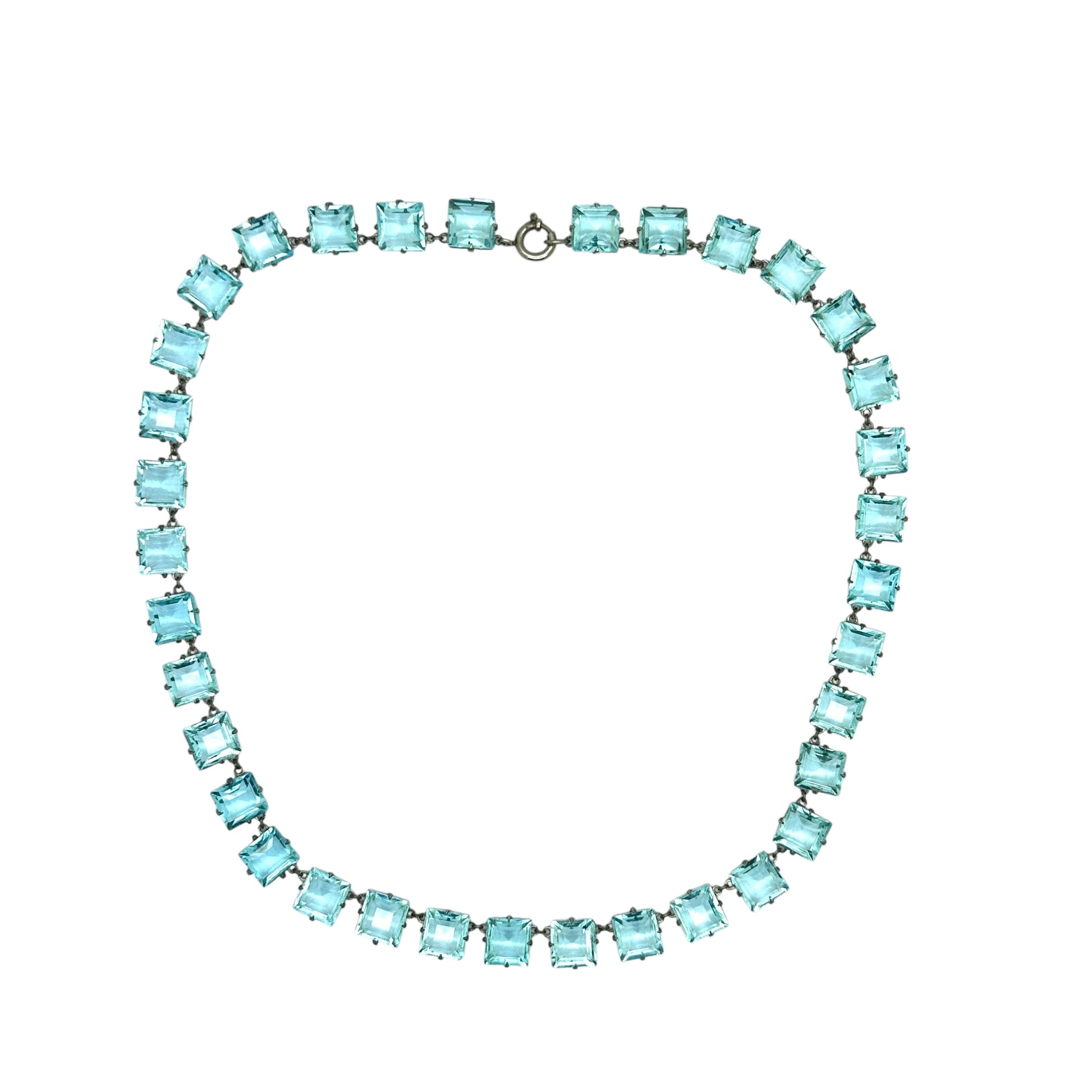 It is set with thirty five square facet cut colour paste stones of a beautiful aquamarine blue linked together to form a continuous rivière. The clasp is the original boltring clasp stamped 'Platinon'