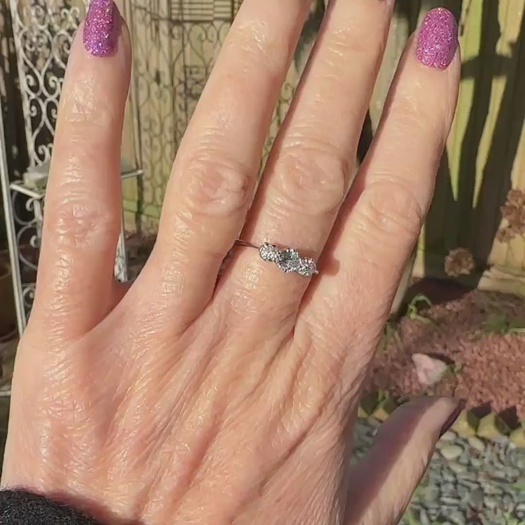 The combination of the larger centre stone with smaller side stones gives good a good show on the hand. Measured in situ, the centre diamond is 0.35ct and each side of centre is 0.12ct, giving an estimated total diamond weight of 0.60 carat.