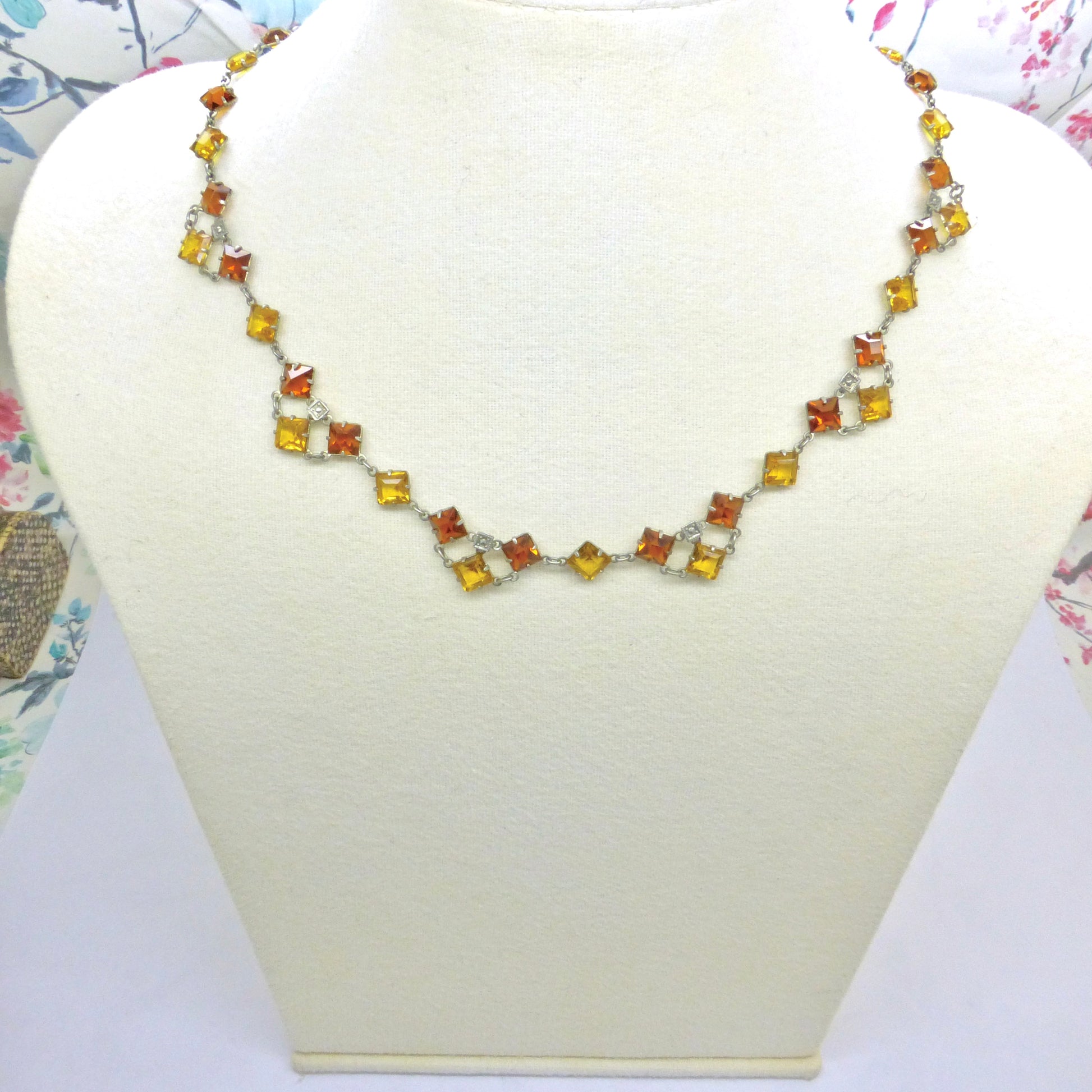 This authentic period necklace has square two colour amber glass stones set in open back settings linked together to form a continuous rivière. The settings and decorative links are a silver coloured metal. It is finished with a silver bullet clasp.