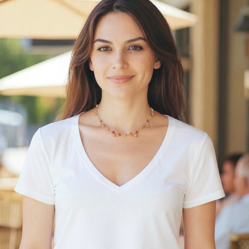 MEASUREMENTS : End to end is 15ins long. Suited for a slim neck so please check your measurements. Could be extended with some fine chain. Please note photo on model is AI generated.