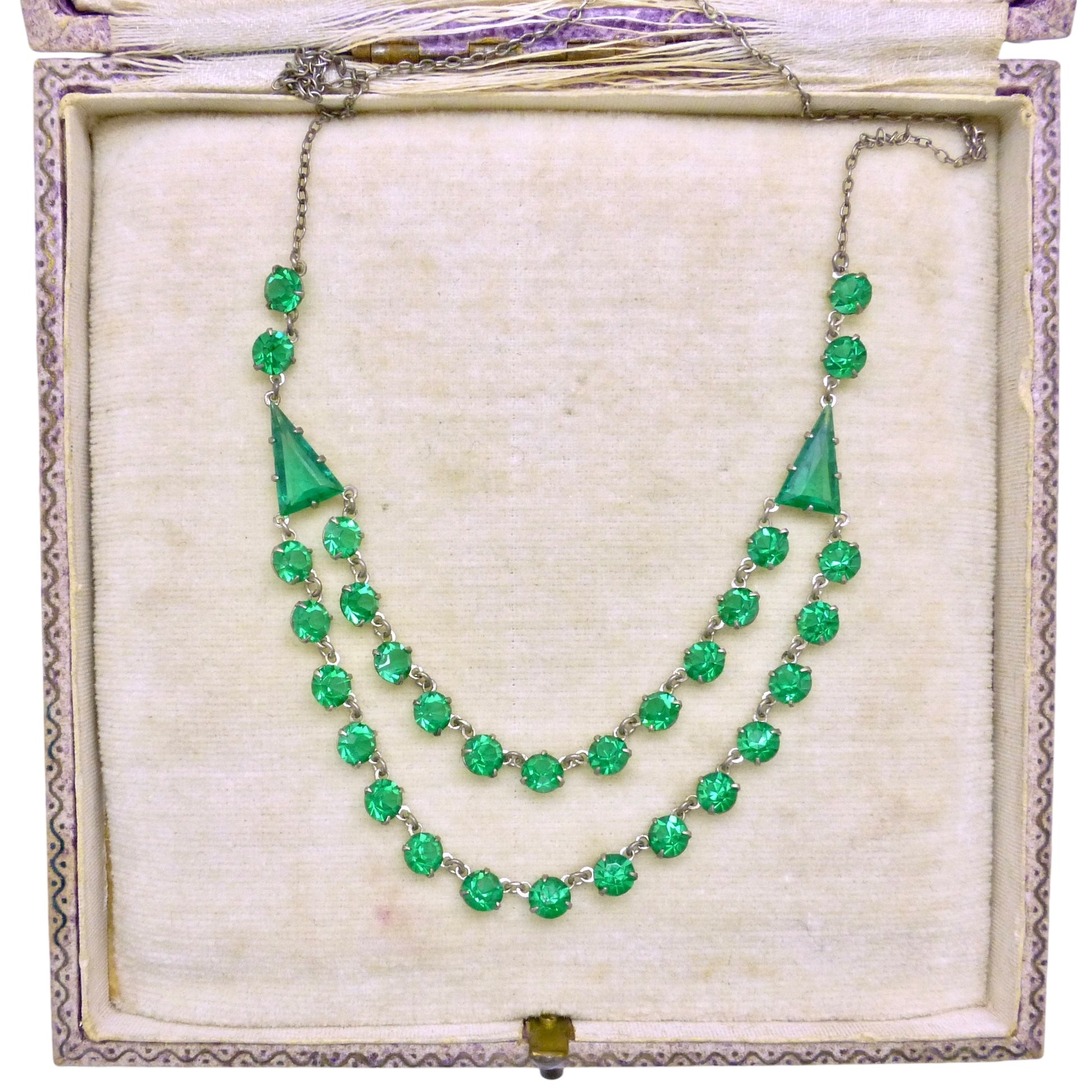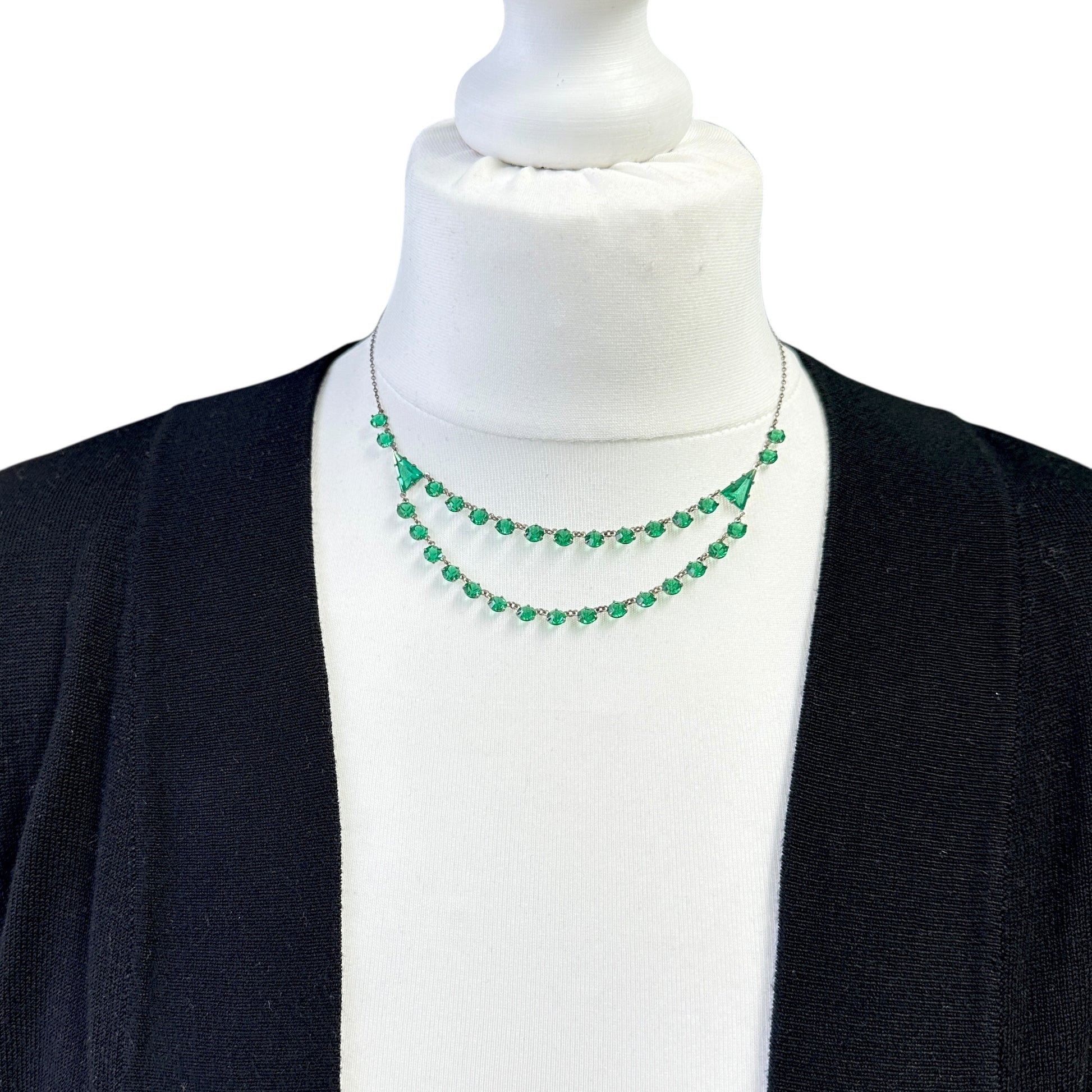 This pretty antique necklace has round facet cut green glass stones set in open back settings linked together to create two rows on the lower half and finished with a fine trace chain. The settings links are a silver coloured metal which tests as silver. It has a boltring clasp.