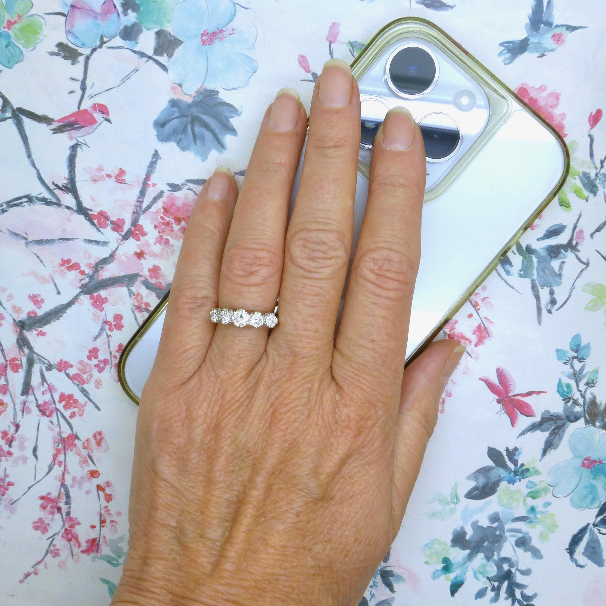 The diamonds are graduated in size and the centre stone is estimated as 0.35ct, each side of centre is 0.18 ct and each end stone is 0.15ct. They are very bright and full of fiery sparkle and brilliance assessed to be G/H colour and VS clarity. Total diamond weight 1.00 carat