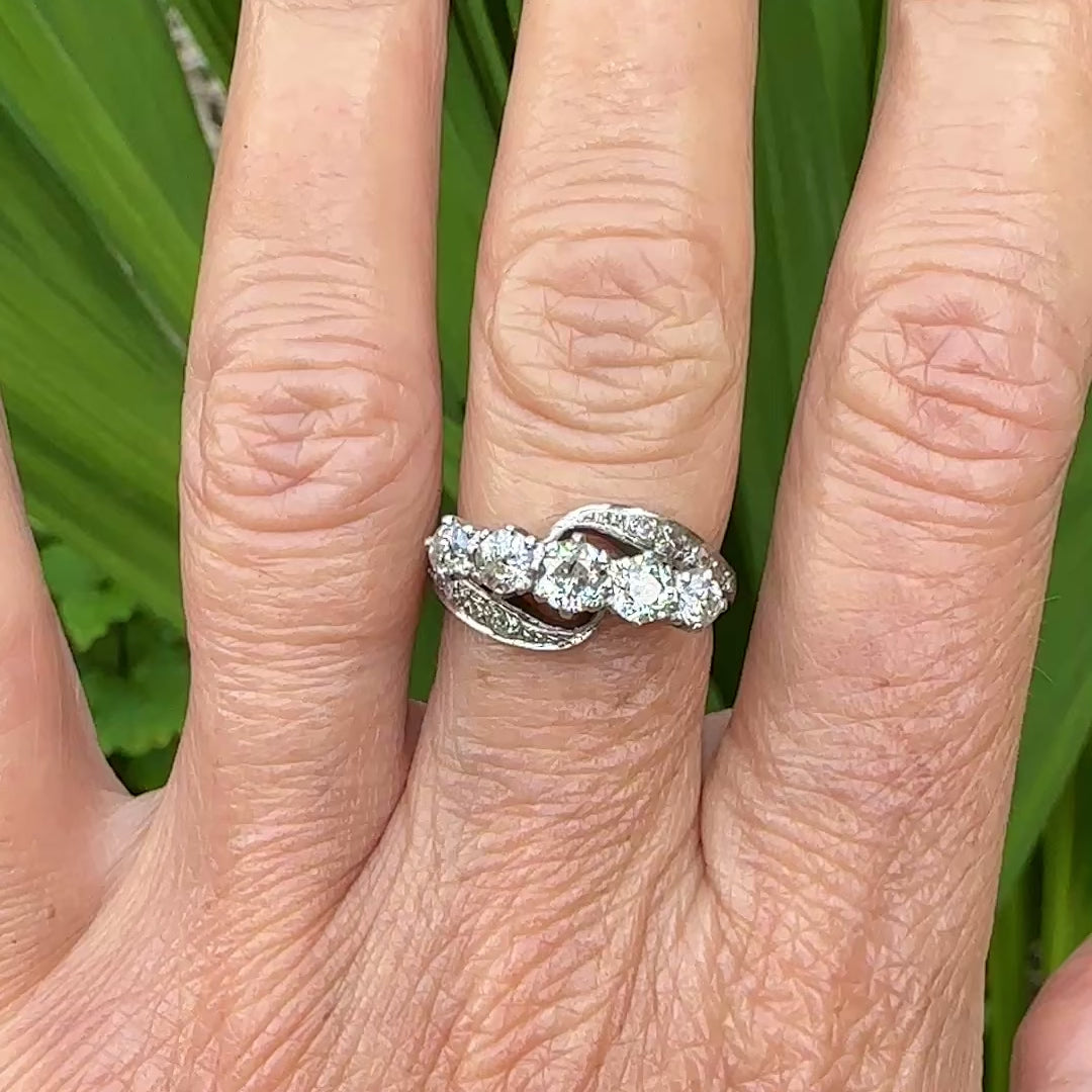 Vintage 18ct white gold old cut diamond five stone bypass ring 1.05ct c1950's